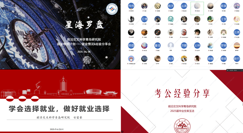 为帮助同学们了解更多择业就业问题,引导同学们正确认识和把握就业形势,树立正确就业观。6月8日,前沿交叉科学青岛研究院开展“星海罗盘”就业帮扶计划-毕业季专场经验分享。本次活动由辅导员安富豪与2025届毕业生柴玉洁为大家讲解研究院当前就业情况和公考备考的经验。
