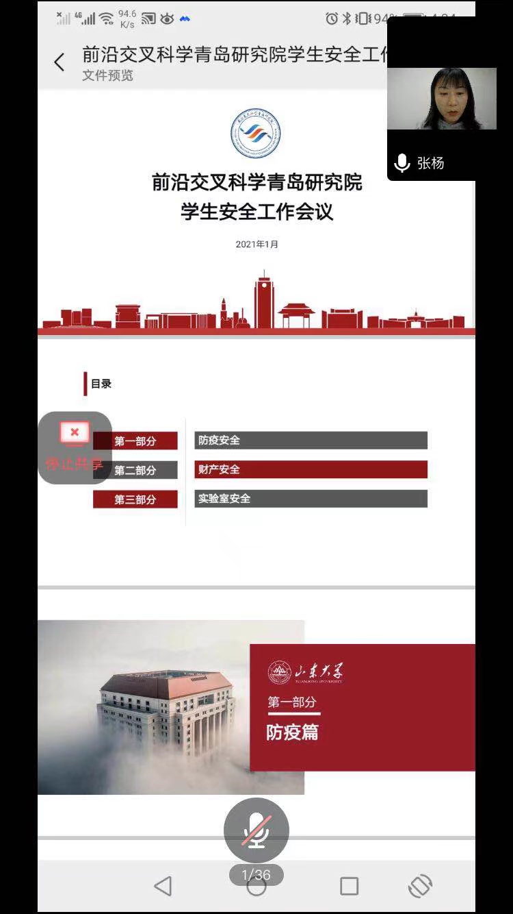 1月11日下午,为传达学校会议精神,部署寒假工作重点,落实假期管理规定,前沿交叉科学青岛研究院召开线上学生假期安全教育主题班会,会议分别就防疫安全、财产安全和实验室安全三方面对学生们做出安全提示。