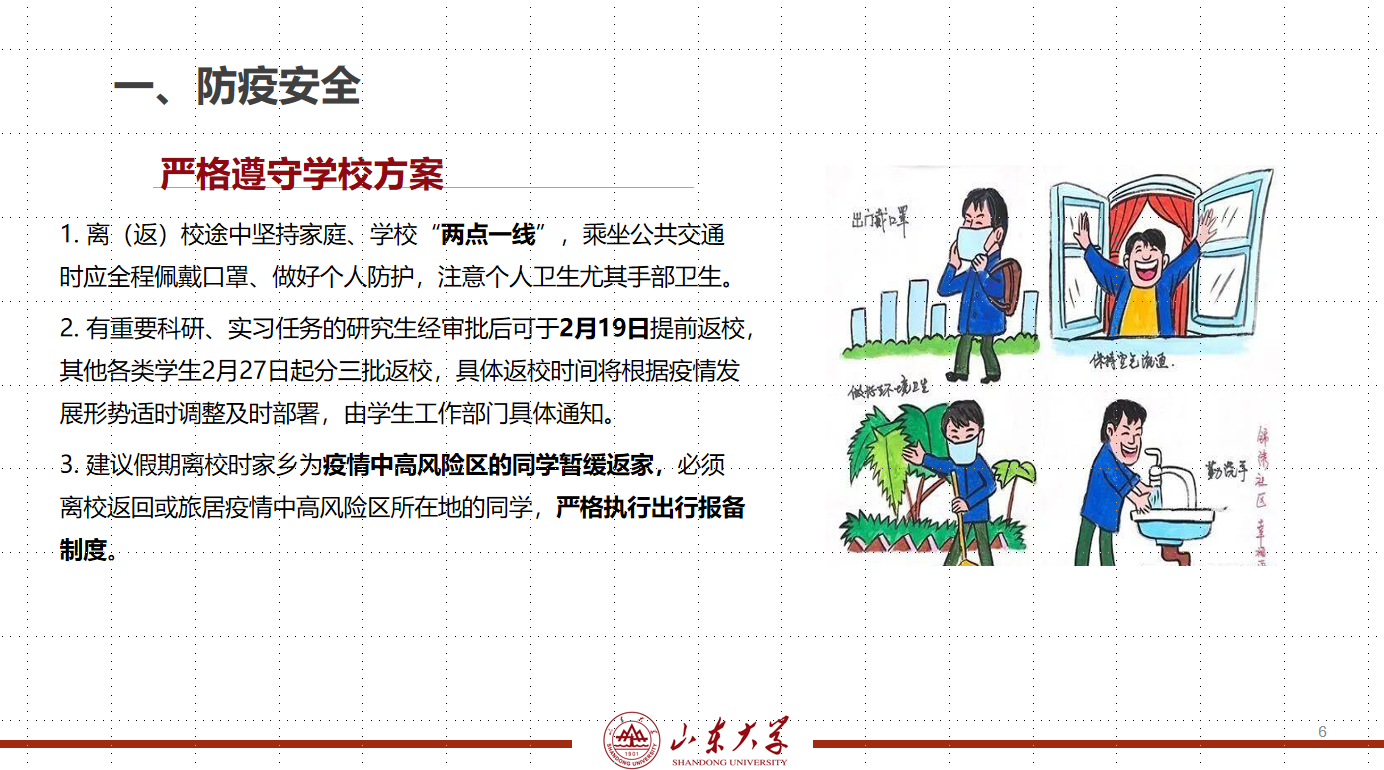 针对当前国内的疫情情况,同学们要充分认识到寒假期间疫情防控工作的重要性、严峻性和复杂性,严格执行学校和研究院相关工作要求,切实做好个人自身防护,研究生党员尤其要提高认识,无论在校还是在家,都要时刻做好表率,发挥党员的先锋模范带头作用,以实际行动发挥主人翁意识,保护好自己和家人的生命健康。