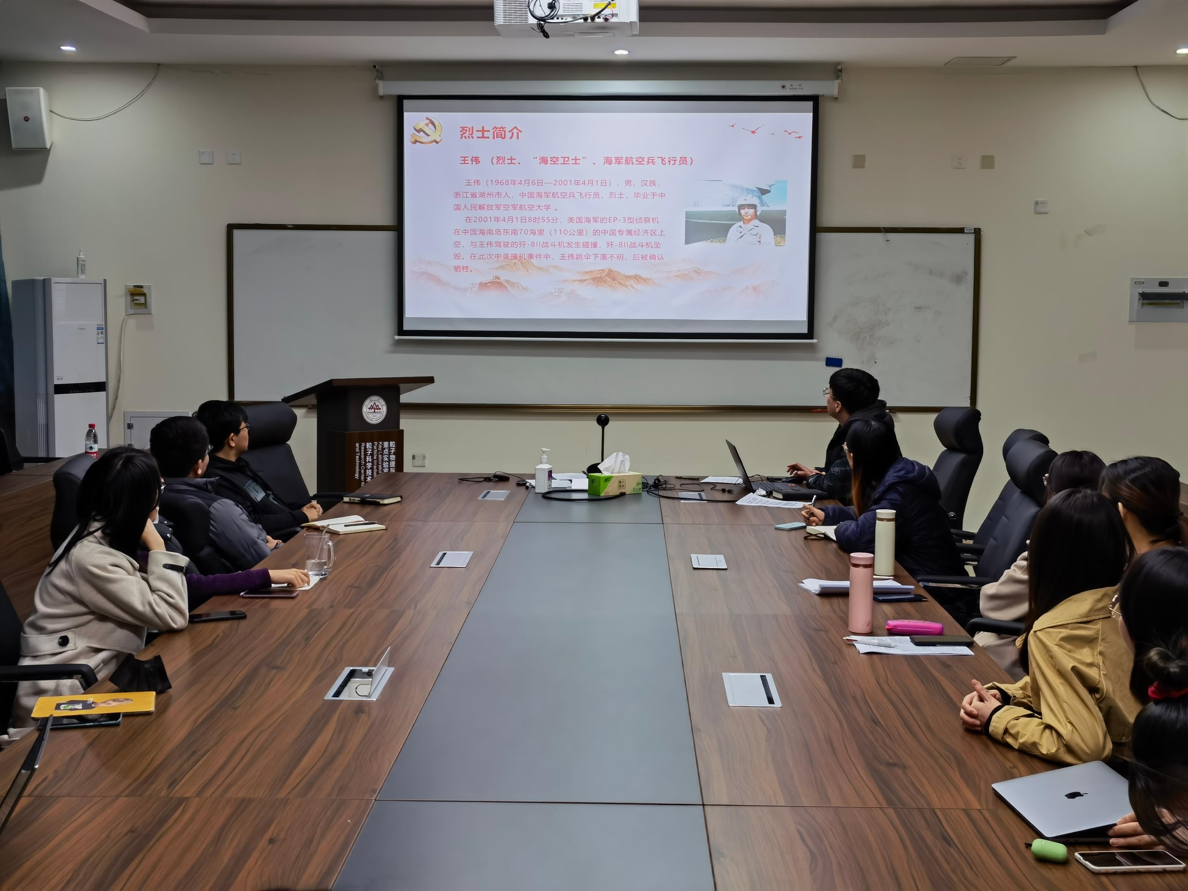 活动开始,首先由党支部书记梁嘉城介绍了中美南海撞机事件的始末。2001年,恰逢美国总统换届,新上任的美国第43届总统小布什,一改前任总统关于建立中美“战略合作伙伴”关系的政策方针,反而将中美关系定位为“战略竞争对手”,企图伙同几个所谓的“盟友国家”全面遏制中国的发展。其中,依仗其强大的军事实力,在未经中国过允许的情况下,派侦察机非法入侵中国南海领空,便是其向中国施压的重要手段。4月1日,当美国再次非法入侵中国领空,为了维护中国的国家主权和领土完整,中国派空军对其进行监视和驱逐。美军军机在完成例行侦察任务后准备返航时,却突然转向,造成与王伟少校驾驶的飞机相撞,中国飞机坠毁,王伟少校跳伞逃生,后被确认牺牲,而美方飞行员却驾驶飞机非法降落在中国机场,得以生还。