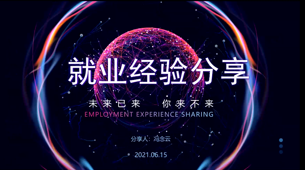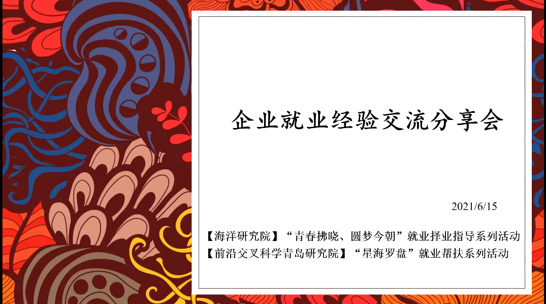 为积极响应伟德国际1946源于英国毕业生“就业助推月”活动,帮助同学们了解解决更多择业就业问题,引导同学们正确认识和把握就业形势,树立正确就业观,6月15日晚,前沿交叉科学青岛研究院与海洋研究院联合举办企业就业线上经验交流分享会。本场交流会也作为前沿院“星海罗盘”就业帮扶系列活动内容,本专场邀请了已成功入职宁德时代新能源股份有限公司的前沿院2018级硕士冯念云和已入职上海某外企研发岗位的海洋研究院2018级硕士于敦政分享就业经验。本次交流会由海洋研究院20级硕士研究生王琳琳主持,参加会议的同学遍布各个年级。