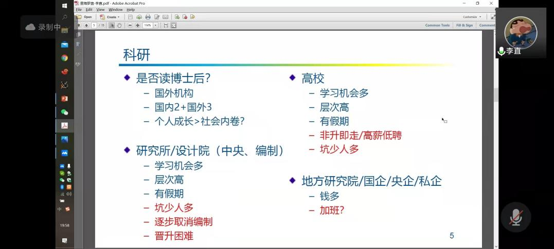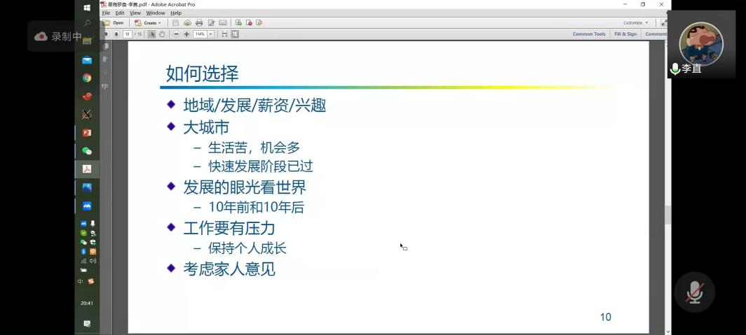 张彤对目前疫情之下的无接触式求职进行了系统的分析和经验分享,指出就业发展的关键是清晰地认识自己,与此同时,也分享了诸多求职面试技巧。冯念云针对就业还是读博的问题进行了详细地对比介绍和分析,讲解了面对就业问题我们要如何进行自我定位,并提醒大家抓紧时间,尽早确定个人发展方向,早做准备。李直为同学们详细地阐述了继续深造、工作和考编的要求以及每个方向的不同之处,如何进行职业的规划和选择以及未来的发展等,并就同学们关心的几个就业问题进行详细地说明,同时,强调了基础知识的重要性,扎实的基础知识是求职的敲门砖也是后续求职中笔试环节的重要部分。