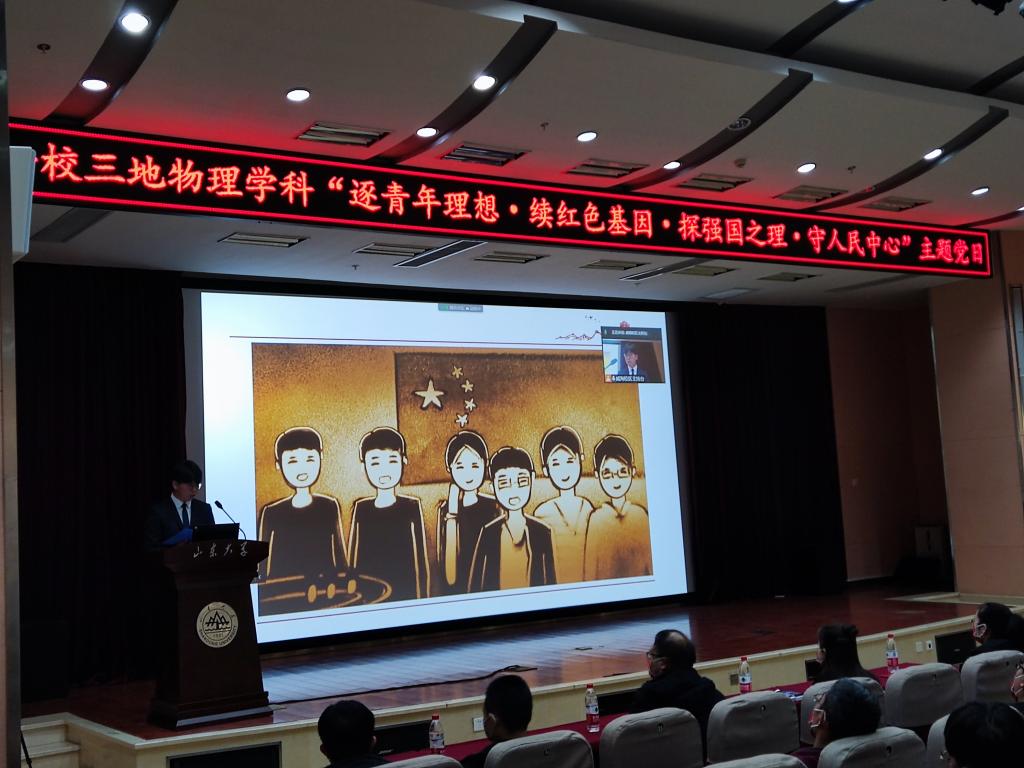 11月25日,为贯彻落实学校党委认真学习贯彻党的十九届六中全会精神部署,学习好领会好贯彻好全会提出的新思想新论断新要求,感悟青年人担当作为,伟德国际1946源于英国一校三地物理学科联合举办“逐青年理想续红色基因,探强国之理守人民中心”主题党日活动。威海校区主会场设在闻天楼东报告厅,青岛校区前沿交叉科学青岛研究院、济南校区物理学院通过腾讯会议线上参会。
