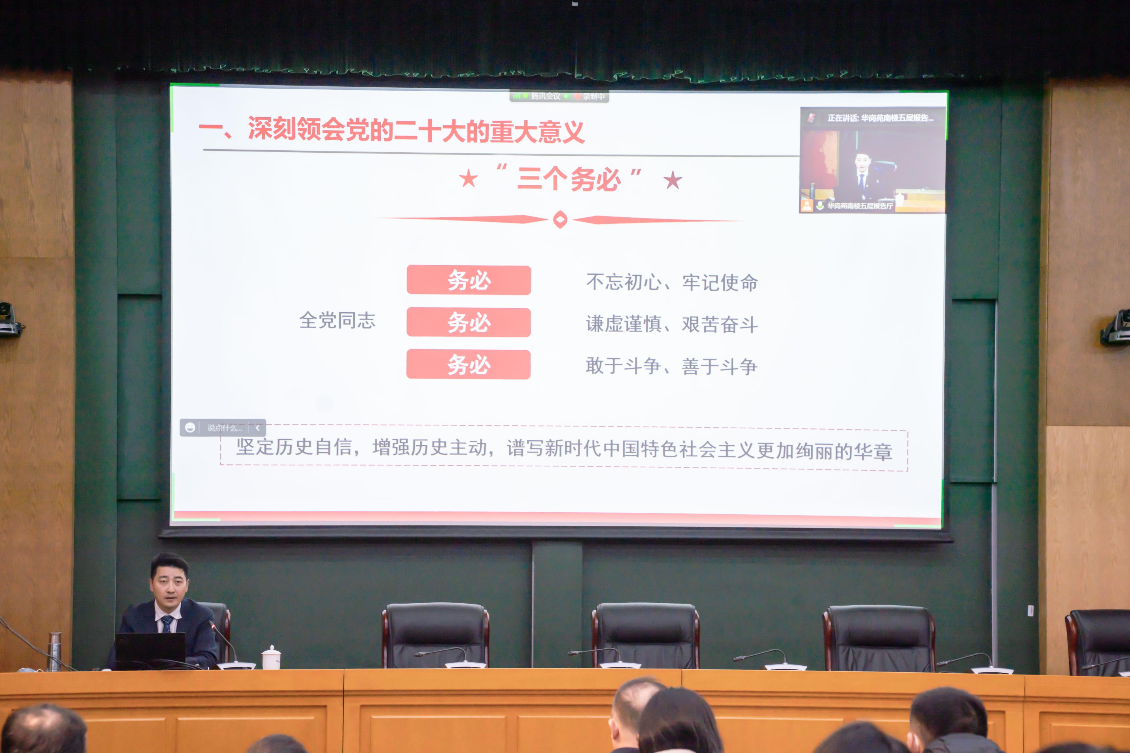 在理论学习环节,学校政治学与公共管理学院副院长、国家治理研究院副院长孔新峰应邀对党的二十大精神进行了专题讲解。孔新峰围绕党的二十大报告的主题,从深刻领会党的二十大的重大意义、深刻领会过去5年的工作和新时代10年的伟大变革、深刻领会习近平新时代中国特色社会主义思想的世界观和方法论等方面,对党的二十大精神进行了详细解读,着重讲解了开辟马克思主义中国化时代化新境界、以中国式现代化全面推进中华民族伟大复兴等重要政治论断的重大意义和深邃内涵。