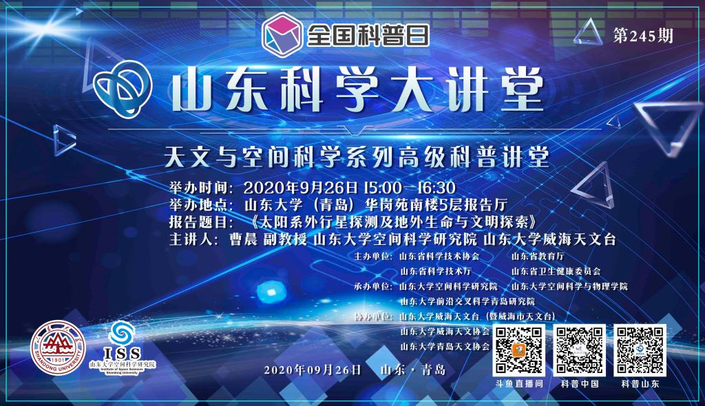 【活动延期举办通知】原定于2020年9月26日15时举办的“山东科学大讲堂”天文与空间科学系列高级科普讲堂,由曹晨副教授为大家带来的《太阳系外行星探测及地外生命与文明探索》主题报告,因故延期举办,具体时间另行通知,给大家带来的不便我们深表歉意,望理解并相互转告。
