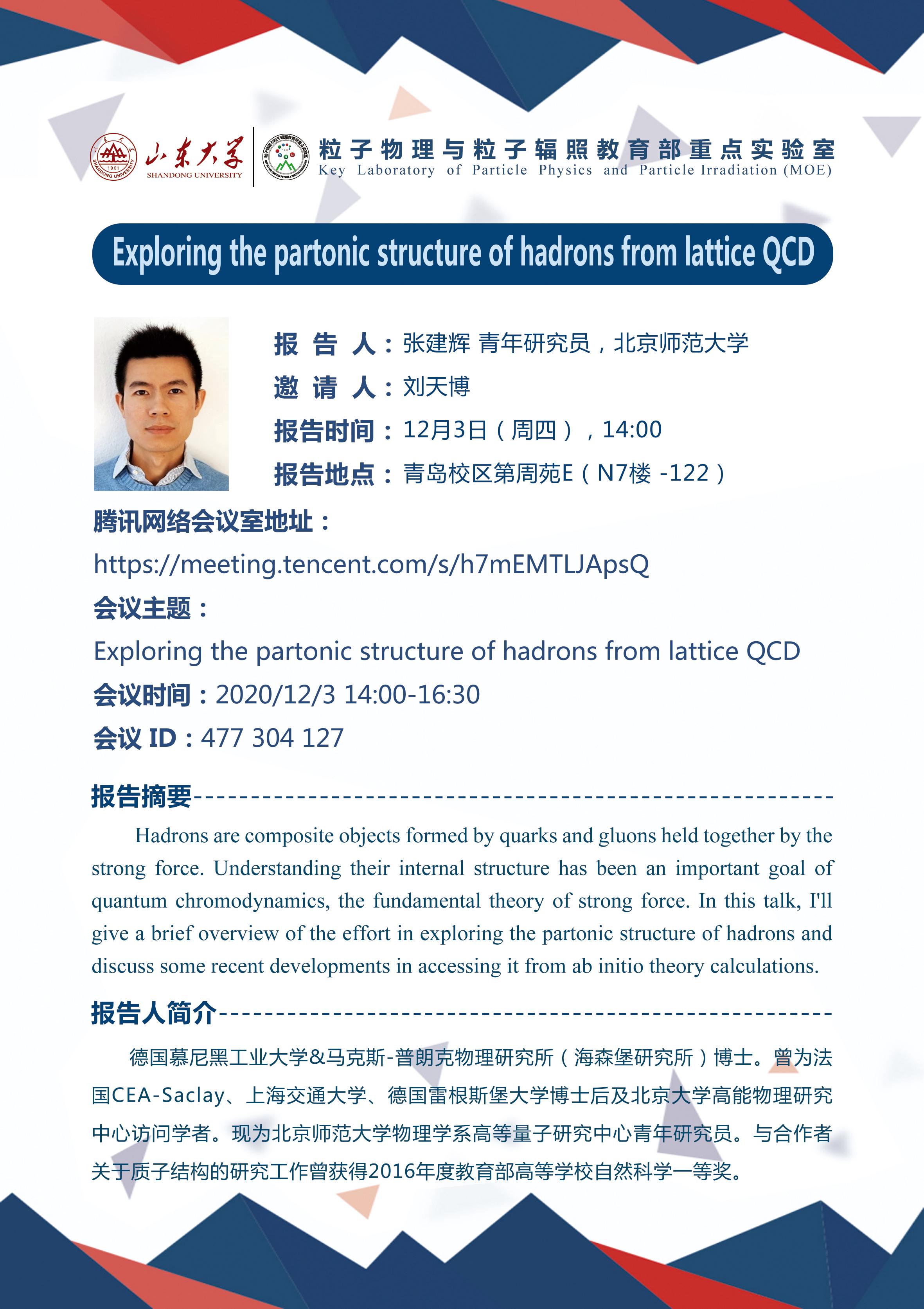【20-12-03】张建辉:Exploring the partonic structure of hadrons from lattice QCD
